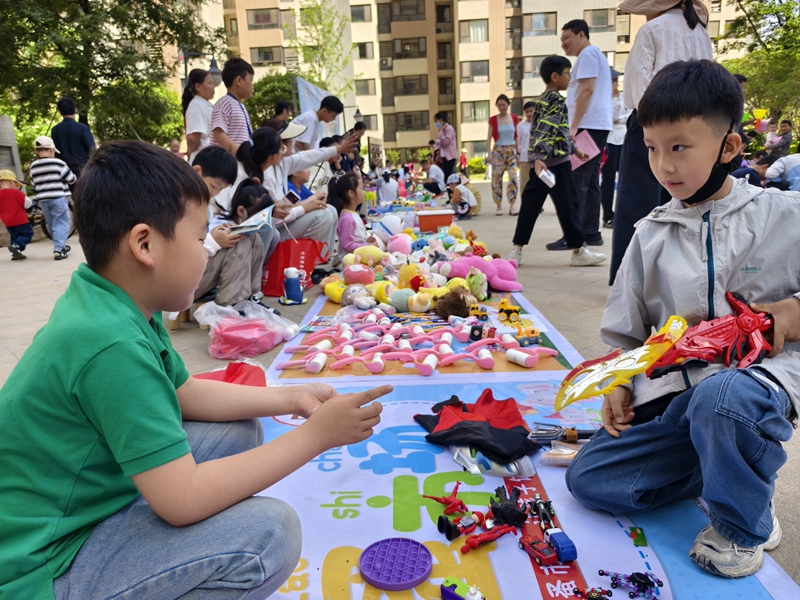 活動當天,小區廣場被布置得熱鬧非凡,彩色的氣球、歡快的音樂和孩子們的笑臉交織成一幅溫馨的畫面。孩子們在家長的陪伴下,紛紛化身“小老板”,將自己的閑置玩具、圖書、手工藝品等擺放在攤位上,并貼上了價格標簽。