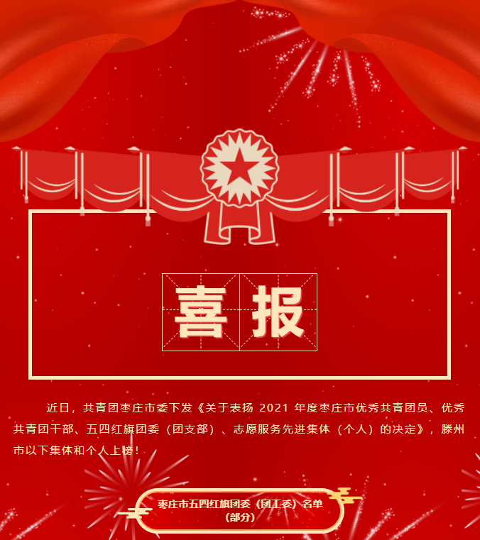 喜報 近日,共青團棗莊市委下發《關于表揚 2021 年度棗莊市優秀共青團員、優秀共青團干部、五四紅旗團委(團支部)、志愿服務先進集體(個人)的決定》,滕州市以下集體和個人上榜!棗莊市五四紅旗團委(團工委)名單(部分)棗莊市五四紅旗團支部(團總支)名單(部分)棗莊市優秀共青團員名單(